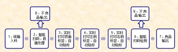 針對不同規(guī)格尺寸紙箱在線掃碼、數(shù)據(jù)處理、在線打印標(biāo)簽、自動貼標(biāo)、自動掃碼檢查、不良品剔除等